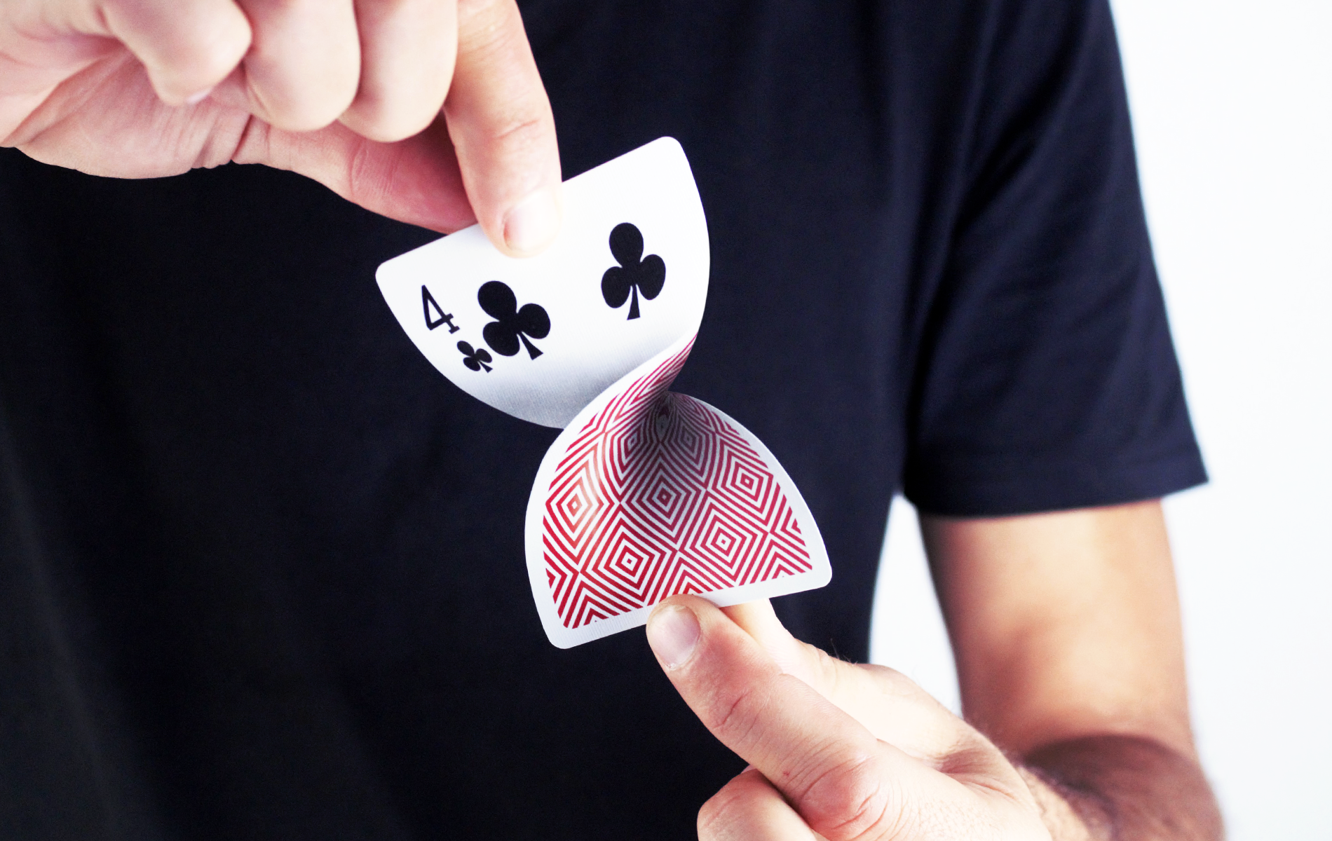 Use perception distortion trickery to reveal a force card like never before! Use your favourite force with the QH or 4C, then show a strange looking card that just is a jumble. Hold it up and just blow or twist, the card spins and magically reveals the card they were just thinking of. A treat of physics and biology mixed with magic..
